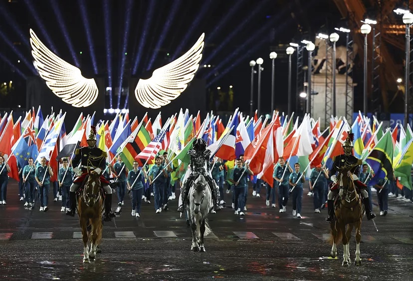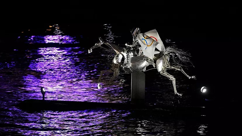 پس از یک نمایش خیره کننده از حرکت یک اسب فلزی و سوار فلزی آن بر روی رودخانه سن، زنی با زره نقرهای سوار بر اسب زندهای که پرچم رسمی المپیک را حمل میکرد، در مقابل برج ایفل ظاهر شد.