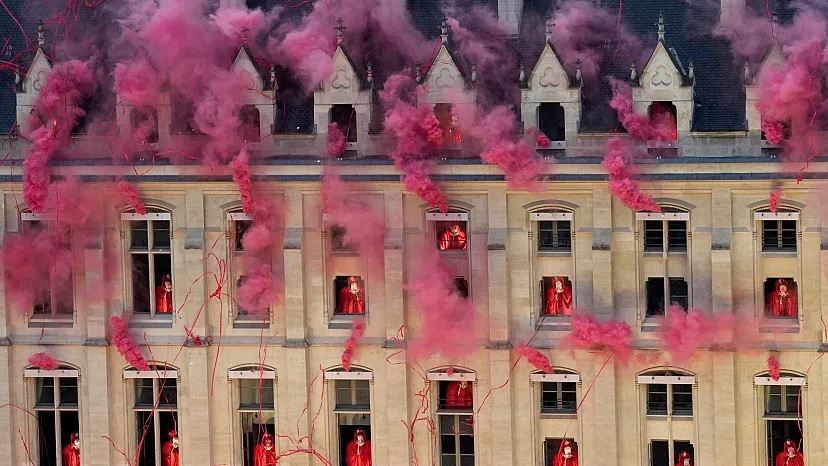 مراسم با جلوههایی از دودهایی به رنگ پرچم فرانسه بر فراز یکی از پلهای رودخانه سن پاریس آغاز شد.