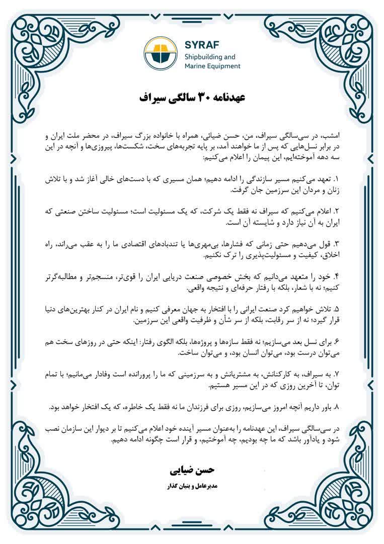 در سیسالگی سیراف، این عهدنامه را بهعنوان مسیر آینده خود اعلام میکنیم، تا بر دیوار این شرکت نقش ببندد و یادآور باشد که ما که بودیم، چه آموختیم و چگونه قرار است ادامه دهیم.
