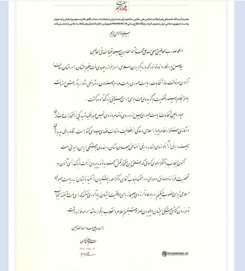 اکنون اینجانب با تشکر از همهی کسانی که در خلق این افتخار نقش آفریدهاند، به پیروی از ملت بزرگ، رأی آنان به شخصیت فرزانه، و صادق، و مردمی، و دانشمند جناب آقای دکتر مسعود پزشکیان را تنفیذ و ایشان را به ریاست جمهوری اسلامی ایران منصوب می کنم. و با دعا و آرزوی صمیمانه برای موفقیت ایشان، یادآوری می کنم که رأی ملت و تنفیذ اینجانب تا هر زمان که مشی همیشگی ایشان در پیمودن صراط مستقیم اسلام و انقلاب برقرار باشد، ادامه خواهد داشت.