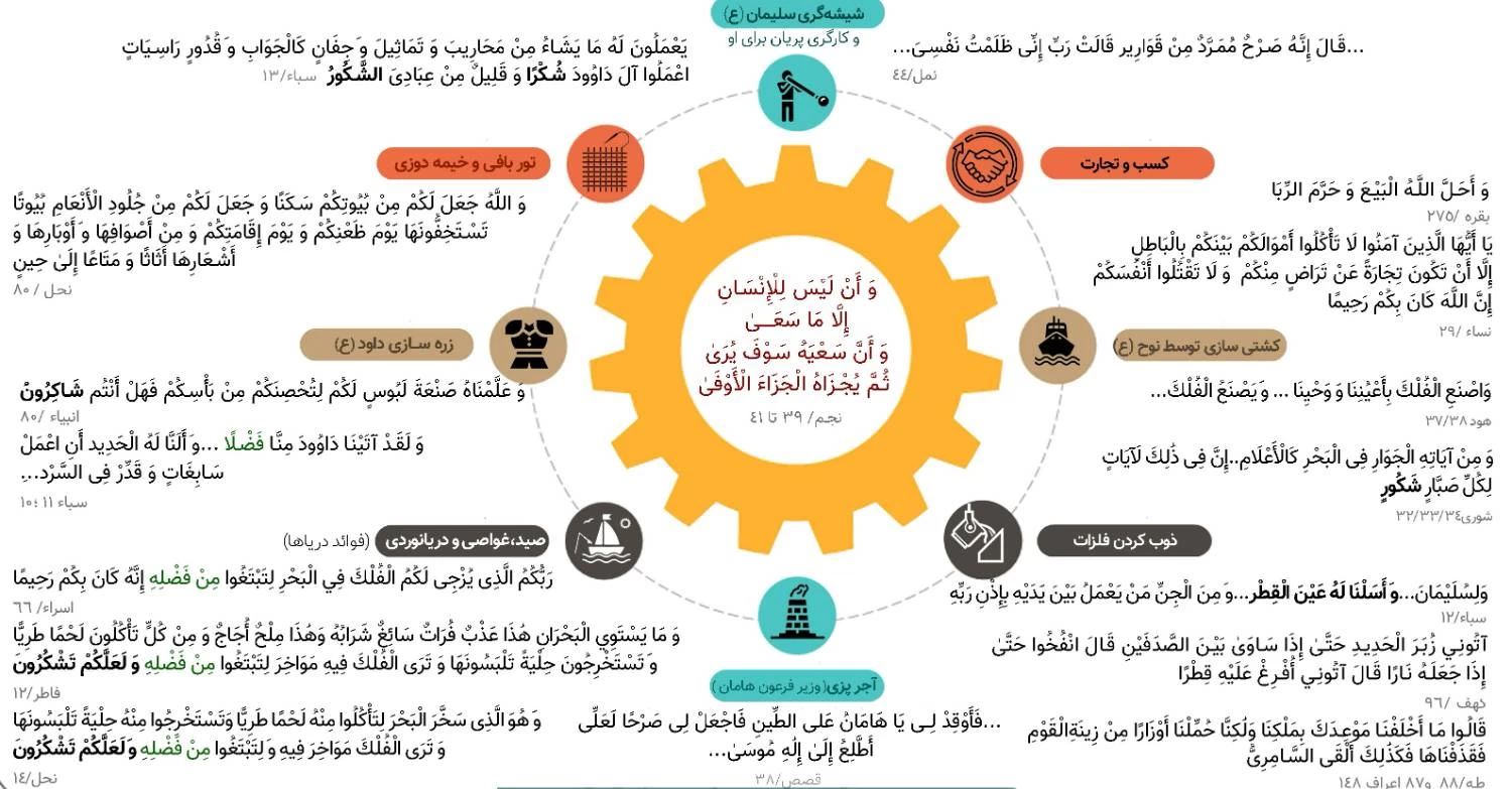در آیات ۳۹ سوره مبارکه نجم به ضرورت سعی و تلاش انسان تصریح دارد «وَأَنْ لَيْسَ لِلْإِنْسَانِ إِلَّا مَا سَعَى؛ و اينكه براى انسان جز حاصل تلاش او نيست» و در آیه ۴ سوره مبارکه لیل بر گوناگونی این کوشش و تلاش اشاره دارد «إِنَّ سَعۡيَكُمۡ لَشَتَّىٰ».